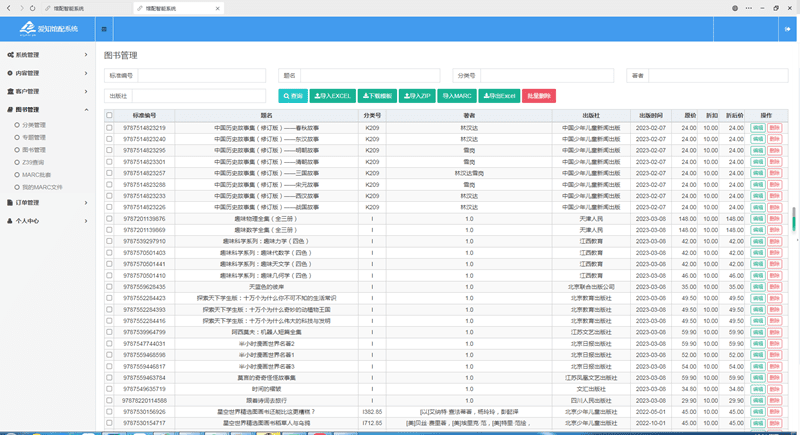 2.用户可以通过EXCEL或标准CNMARC数据上传和更新图书信息,包括书名、作者、出版社、ISBN号、价格等详细信息。